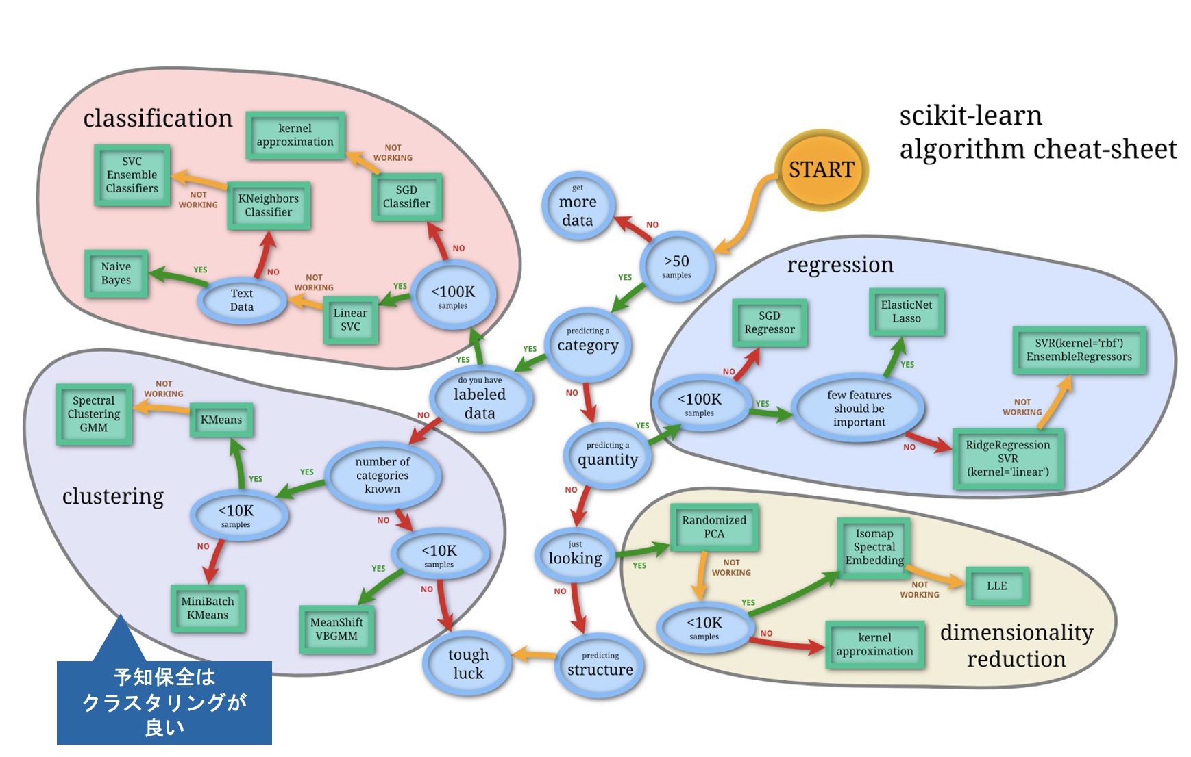 scikit-learnの図を見ると「labeled data」が「yes」なら「classification」へ、「no」なら「clustering」へ分岐していますが、これはラベルデータがある場合は分類問題や回帰分析が適用されますが、ラベルがない場合は教師なし学習のクラスタリングを使用することを意味します。