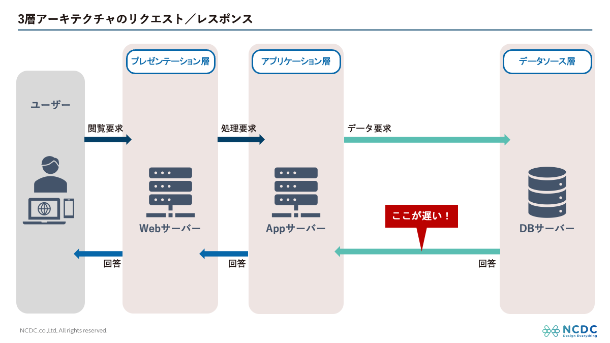 なぜDBの反応が遅くなりがちなのかという詳細説明は省略するので、とりあえずここでは「遅いのはそういう仕様だから仕方ない」と考えてください(もちろん、すべてのDBが遅く、ボトルネックになるということでもありません)。