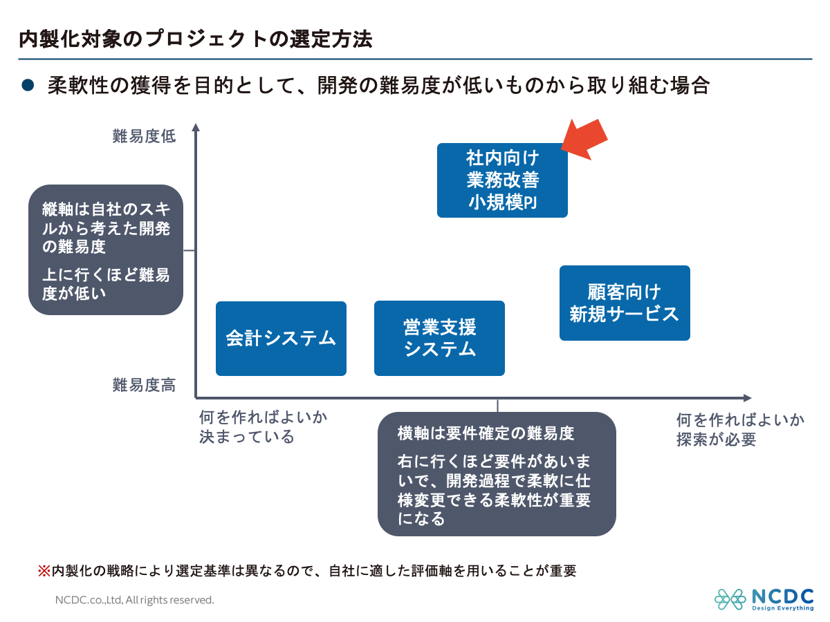 内製化を成功させるには、まず内製化に適したプロジェクトとそうでないものを正しく見極めることが重要です。