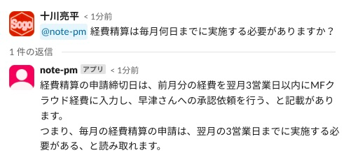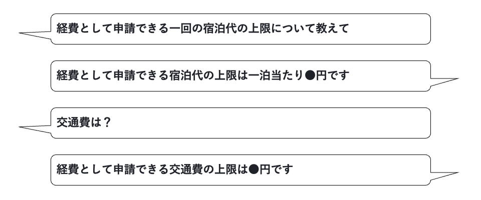 LLMが単純な検索より優れている点として、前の文脈を理解した上で回答を生成してくれることが挙げられます。先程の宿泊代に関するやりとりの次に「交通費は?」と短文で質問をすると、経費申請の話の続きであることを理解して、経費精算の交通費上限について回答してくれるようになるはずです。