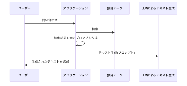 膨大な情報を学習済みのLLMに独自のデータを情報源として加えて使用するには、一般的に検索拡張生成 (RAG: Retrieval Augmented Generation)という手法を用います。