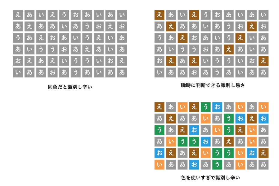 ところが、色の数を増やすと悪影響も現れます。上図右下のように、「い」「う」「お」にもそれぞれ別の色を付けることで、反対に、どこに何の文字があるか見分け難くなってしまったことがわかります。