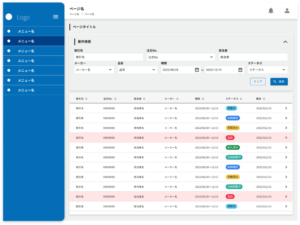 上図は、検索結果がテーブルで表示されている状態です。ステータスをチップの色分けで表現していますが、多くの色が使用されているため、対象がどのようなステータスにあるのかが一見分かりにくくなっています。ここでは検索結果をソートしてステータスごとにまとめて表示することも可能になっているため、本来であればこのような機能との組み合わせの中で色を選定し、3色程度に絞り込んで使い分けるのが望ましいでしょう。