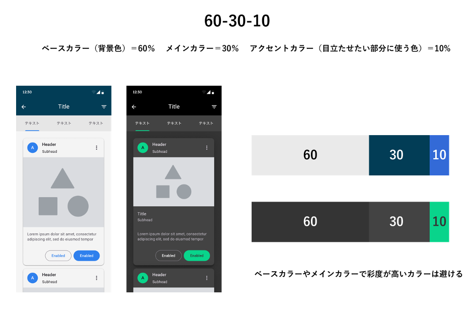 基本的な配色のルールとしてよく使用される「60-30-10」は、UIデザインにおいても良い配色を考えるのに役立つ指針になります。3つの色を以下の比率で使用することで、簡単にバランスのとれた配色を実現できます。
