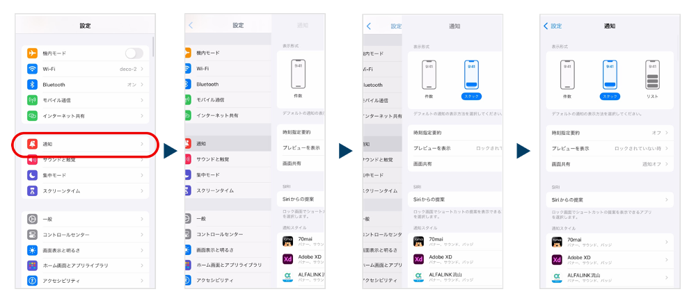 上図はiOS の設定画面において、「通知」をタップしてから次画面に切り替わるまでの様子を示しています。ここでは、ボタンをタップしてから画面が切り替わるまでに、1秒程度の短いアニメーション(スライドイン)が発生しています。