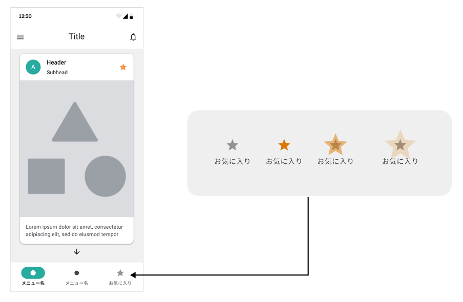 上図は、画面に表示されているコンテンツを気に入り右上にある星のボタンを押した際に、右下にある「お気に入り」に保存されたことをわかりやすく示すために、右下にある「お気に入り」の星のマークが点灯し、ふわっと広がっていって、最後は消えるというインタラクションになっている例を示しています。こうすることで、ユーザーが行ったアクションに対して明確な反応が返って来ると同時に、「お気に入り」したものがどこに保存されたかが分かるようになっています。