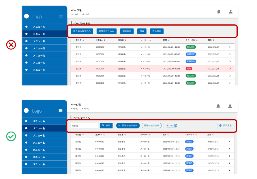 上図の悪例は、同じようなボタンが並んでいるせいで、それぞれのボタンの役割が識別しにくくなっています。改善例を見てみましょう。上図の好例では、検索窓があることに加え、検索結果の絞り込みを行っているか、絞り込みの条件は何かなどが一見して分かるようになっています。また、使い方に迷ったときは、別ウィンドウで「使い方」が開くことや、表示設定をどこから変えればよいかが一目見て分かりやすい点も改善のポイントになっています。