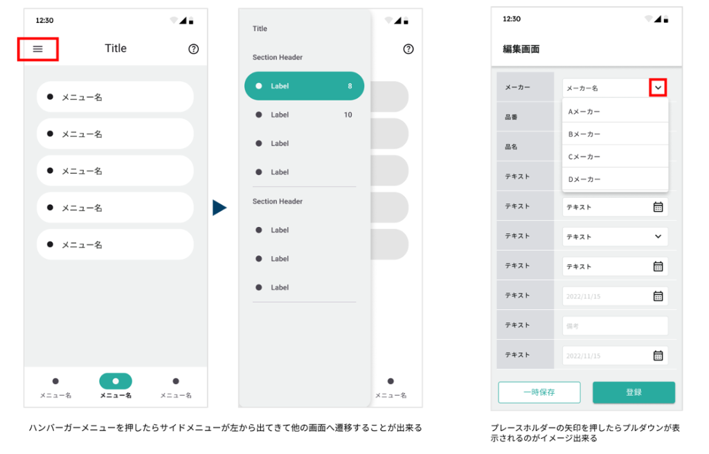 - 骨格段階は、画面構成や操作方法などを具体的に設計していきます。