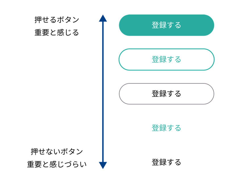 キーカラーでベタ塗りされたボタンは、押せることと、重要性の高さをユーザーに直感的に伝えます。一方で、テキストだけのボタンは、押せるかわかりにくく、重要度も低いように見えるため、ユーザーの認知負荷を高めることに繋がります。