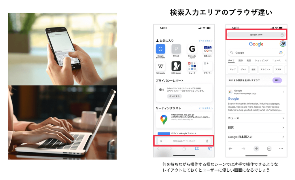 屋外での使用が想定される、片手での操作が想定されるなど、ユーザーの置かれた状況を考慮しながら身体的負荷を軽減するようなデザインを目指すことが重要です。
