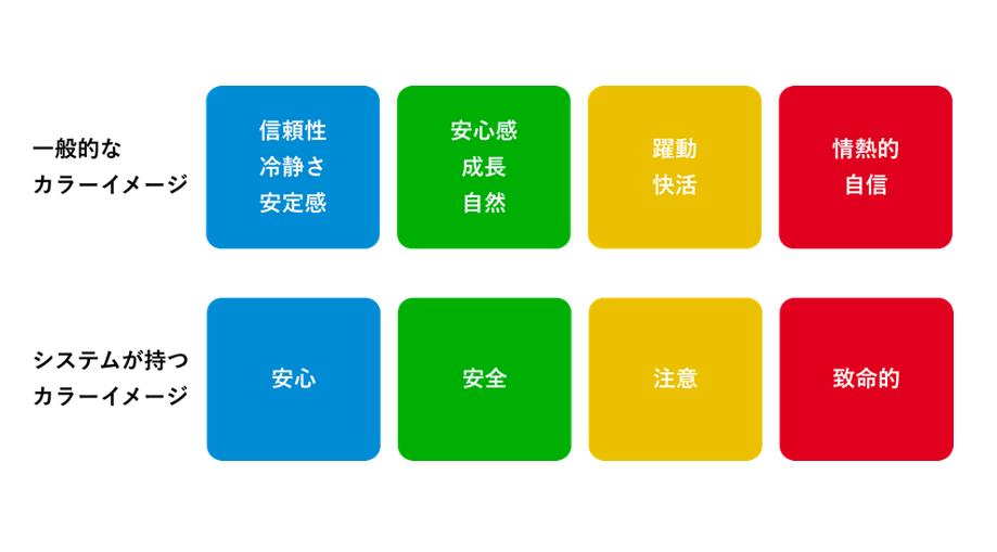 色は、さまざまな意味や効果を持っています。下図では、一般的なカラーイメージとシステムが持つカラーイメージを示しています。