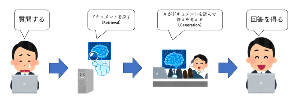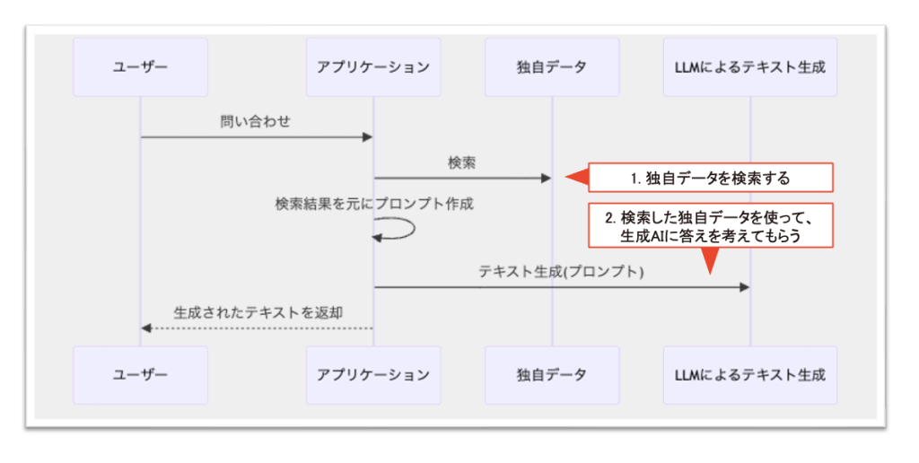 - RAGとは、生成AIを活用して独自のデータを検索し回答を生成する手法。