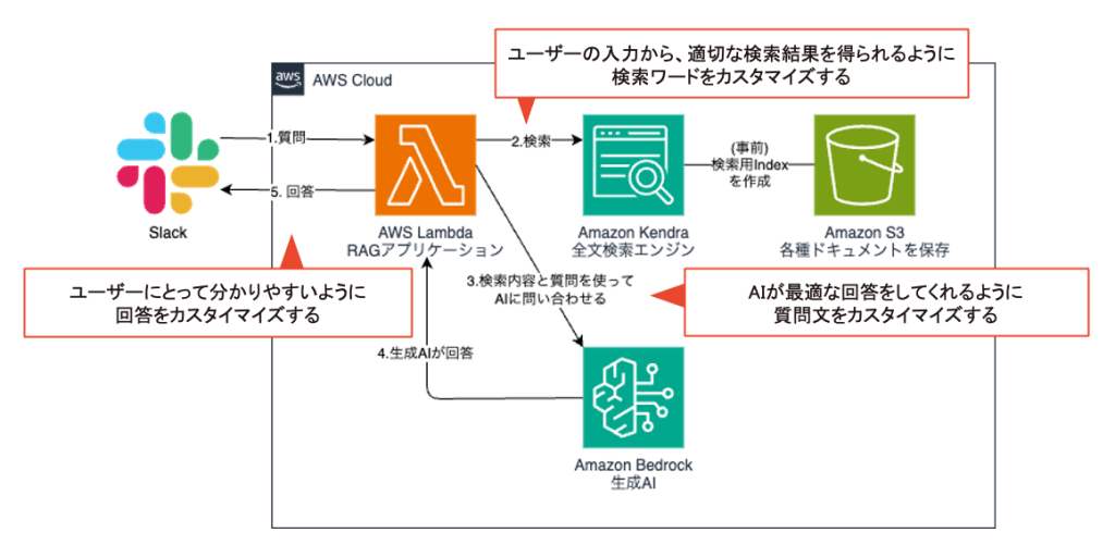 次に、得られた検索結果からAIが答えやすい質問文を作るところもカスタマイズが要ります。もちろん最終的にAIが返す回答も読みにくければ使われなくなってしまうので、ユーザーが読みやすいようカスタマイズすることが必要です。