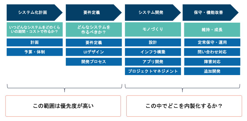 「システム化計画」と「要件定義」は、内製化を考える際に非常に優先度が高いということが分かりました。その上で、続きの「システム開発」「保守・機能改善」をどう内製化していけばよいのでしょうか。