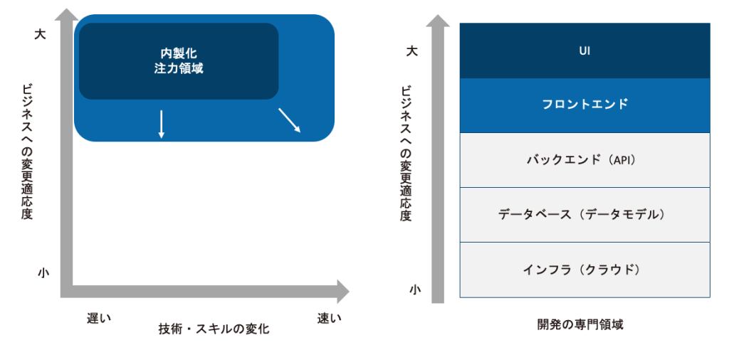 また、上図左の表では「技術・スキルの変化」を横軸に取っています。これは技術やスキルの変化のスピードを表しています。例えば、フロントエンドの技術はバックエンドやデータベースと比べて変化が早いと言われています。常に新しい技術に対応するのはコストがかかるため、変化のスピードが遅い分野を内製化した方が、コスト的には有利になるということを示しています。