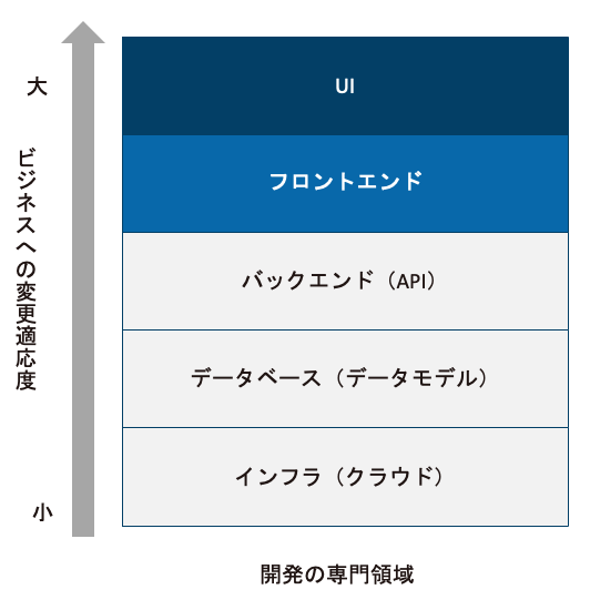 その下のバックエンド、データベース、インフラは、下に行くにつれてビジネスによる変化を受けにくくなります。ビジネスが変わることによってデータモデル(データベース)が変わることも当然ありますが、頻度としてはあまり高くありません。一方で、業務フローを変えるとバックエンドのAPIが変わるということはよくありますし、業務フローを変えずにユーザーへの見せ方だけを変える場合にもフロントエンドは変わってきます。そして、先にも触れたように使い勝手や見た目の良し悪しで差別化を図るために、UIが一番変化の可能性が高いということでこのような並びになっています。