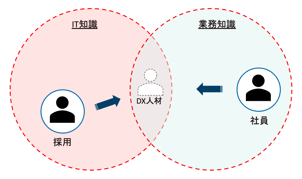 IT知識を持っている人を採用し業務知識をつけるパターン(上図左)と、業務知識を持っている社員にIT知識をつけるパターン(上図右)です。はじめからDX人材が採用できればそれに越したことはありませんが、なかなか難しいため、現実的にはどちらかを選ぶことになるかと思います。