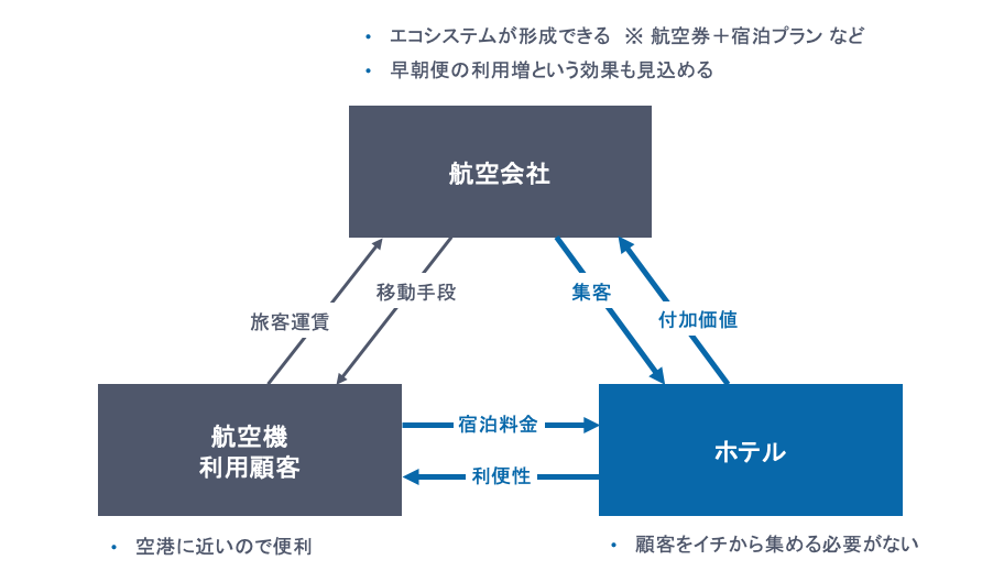 上図の例は、航空会社が、出張のために飛行機を利用するビジネスパーソン向けに新しくホテル事業を始めたケースです。航空会社は早朝便の利用促進などの効果が見込め、顧客は近くにホテルがあることで前泊の利便性を享受できます。ホテル側も一から集客する必要がないため、三者ともに良いビジネスモデルと言えます。