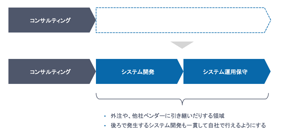 分かりやすいのは、ITコンサルティングを手がける会社が、その後続のシステム開発まで行うケースです。上流のみを行うコンサル会社は開発以降の工程を他社に引き継いだり、外注したりしますが、一連のバリューチェーンを一貫して自社で行うよう体制を整えることで、開発や運用の案件を自然な流れで得られるようになります。