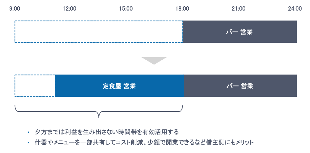 例えば、バーの営業で考えると、稼働している夜間の営業時間以外は利益を生み出しませんが、家賃はかかっています。この日中の空きを埋めるため、昼間に定食屋さんをやりたい別の人に店舗を貸し出すことで、場所代だけでも利益を生み出すことができます。
