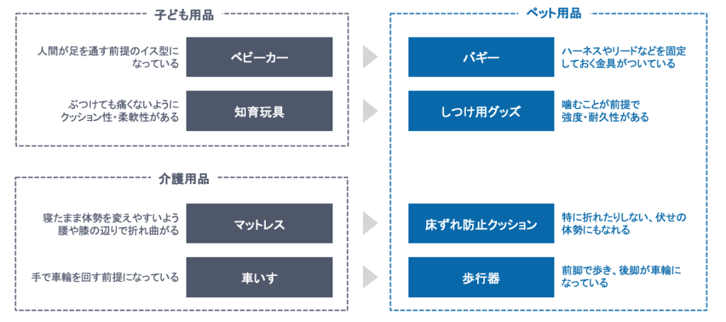 例としては、上図のように人間向けグッズをカスタマイズしてペット向けとして販売するケースが挙げられます。