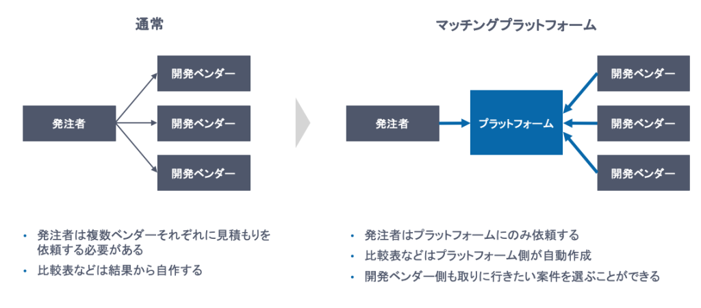例えば、複数社からまとめて見積もりを取れるサービスが挙げられます。発注者が個別に各開発ベンダーに見積もりを依頼し、やり取りを行う従来のフローを、マッチングプラットフォームが仲介することで、発注者は連絡窓口を一本化できます。開発ベンダー側も依頼を待つだけではなく自分たちで案件を探しに行けるメリットが生まれます。