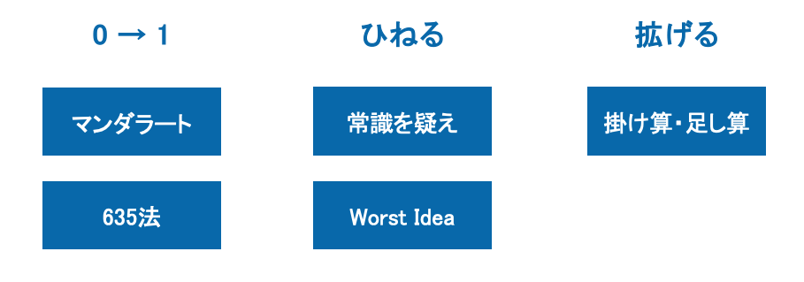 アイデアをゼロから生み出すもの、アイデアをひとひねりして転換するもの、キーワードを拡げるものという観点にまつわる5つをご説明します。