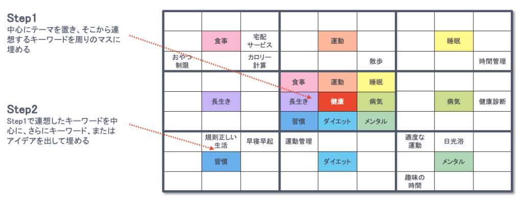 - ステップ1で連想したキーワードを中心にして、さらにキーワードやアイデアを出し(例:習慣、規則正しい生活、早寝早起きなど)、周囲のマスも埋めていきます。