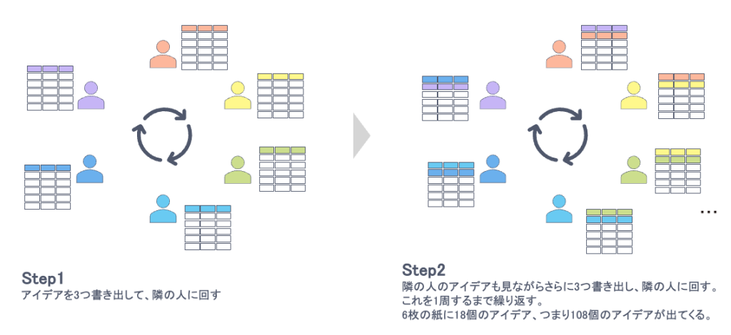- まず、1枚の紙に3つのアイデアを5分以内に書き出し、その紙を右隣の人に回します。