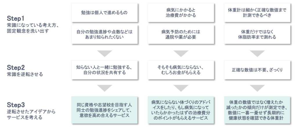 今から取り組もうとしているテーマ、現状のビジネス、サービスを提供しようとしている業界の中で常識となっていること、いわゆる「固定観念」を洗い出します。その常識や固定観念を「逆転」させてみて、その逆転させたアイデアからサービスを考えていくのがこのフレームワークです。