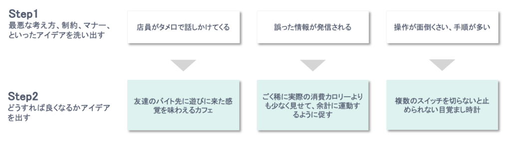 - まず、最悪な考え方、制約、マナーといったアイデアを洗い出します。お客様が怒り、クレームを入れたくなるような最悪なサービスを考えてみましょう。