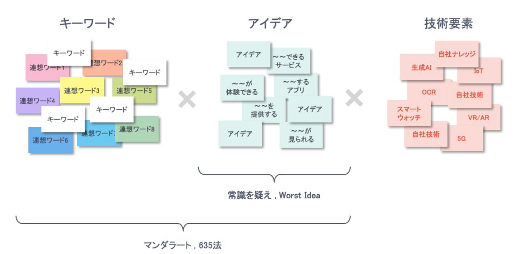さらに、今まで出たキーワードやアイデアだけでなく、ITを活用した技術要素(例:生成AI、OCR、VRなど)や自社独自の技術やナレッジも掛け合わせて、新たなアイデアへ拡張します。
