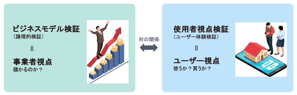 「ビジネスモデル検証」では、事業者視点で「どうやったら儲かるのか」「どうやったら認知されるのか」といったビジネスモデル自体を検証し、収益シミュレーションなども行います。一方で、いくら儲かるビジネスモデルであっても、使用者の視点に立った時に「使いにくい」「使う意味があまりない」となってしまえば、結局使われずに終わってしまう可能性があります。