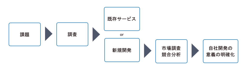 このように、既存のツールや既存サービスの活用も視野に入れながら、最適な手段を選択することが重要です。また、新規開発を進める場合でも、自社で開発するメリットをしっかりと整理して進めていきましょう。