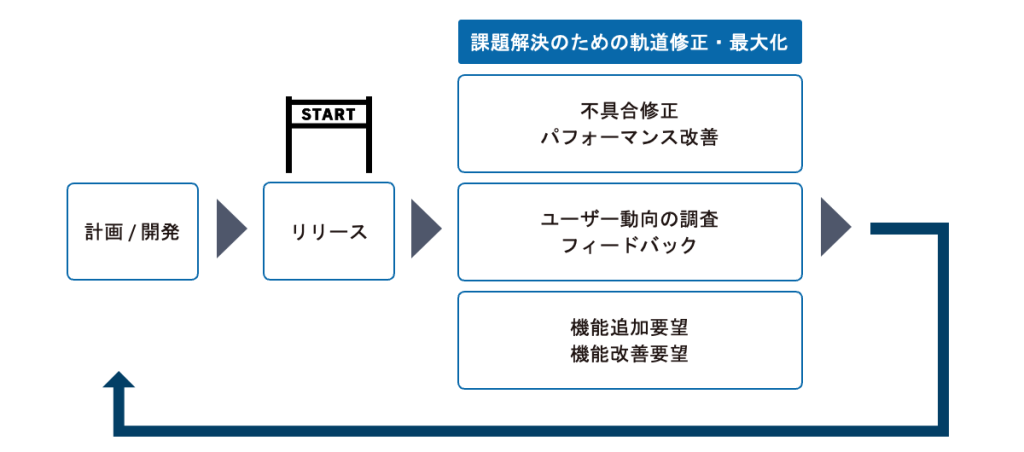 アプリケーションは作ったら終了ではなく、稼働して初めてスタート地点です。最初のリリースはミニマルな機能でのリリースとなることも多く、実際のユーザーの声を聞きながら改善を続けていきます。