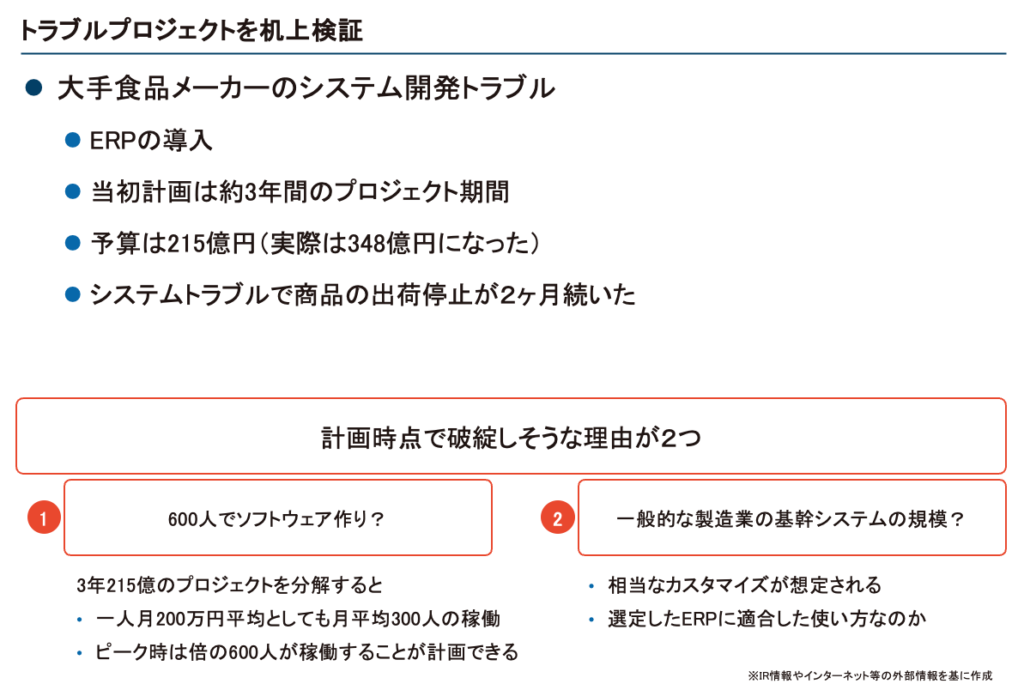 トラブルの原因については、計画段階での問題が指摘できるかと思います。粗い試算をしてみると、最盛期にはおそらく少なくとも600人程度の人員が同時にシステムを開発するような計画が組まれていることが読み取れます。このような規模のプロジェクトは、運営が非常に困難です。なぜなら、ソフトウェア開発は形のないものを作り上げる作業であり、高層ビルを作るような大人数でのモノづくりには適していない特性があるからです。さらに、費用計画から推測するに、計画当初から多くのカスタマイズが要件として盛り込まれていたことが考えられます。ERPパッケージはできるだけカスタマイズせずに使うことが前提になっているものです。要求を満たすために、最初から多くのカスタマイズを要するのであれば、ERPパッケージそのものの選定が正しかったのか?もしくは業務をERPに合わせることを前提に進めるべきだったのではなかったのか?という疑問が生じます。