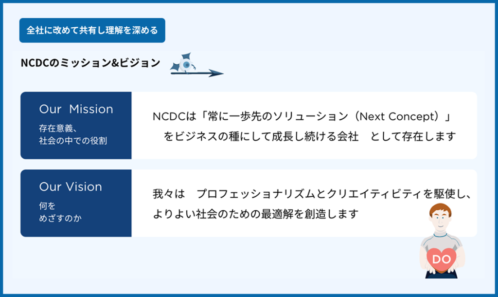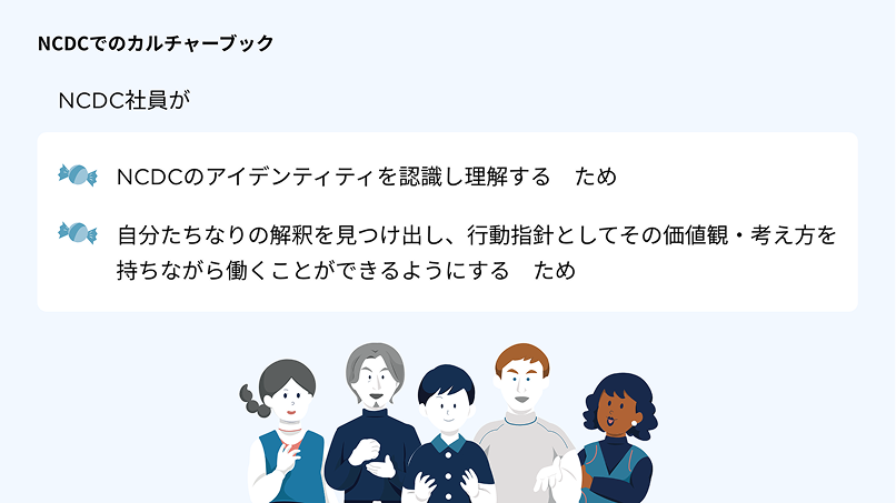弊社のカルチャーブック制作の目的は、社員一人ひとりがNCDCという会社のアイデンティティをしっかりと認識し、理解することにありました。
