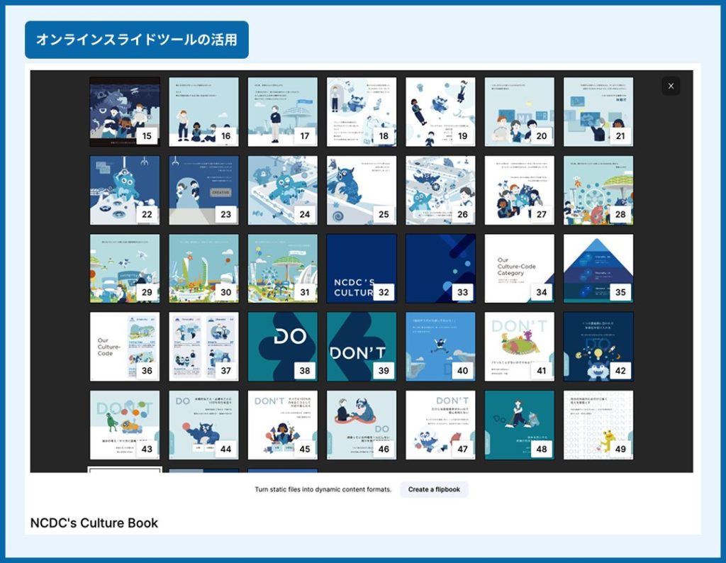 NCDCでは、ここでご紹介したようなカルチャーブック制作をはじめ、ブランドパーソナリティの浸透に役立つワークショップの実施やノベルティの制作など、インナーブランディングにまつわる様々なご支援を行っております。