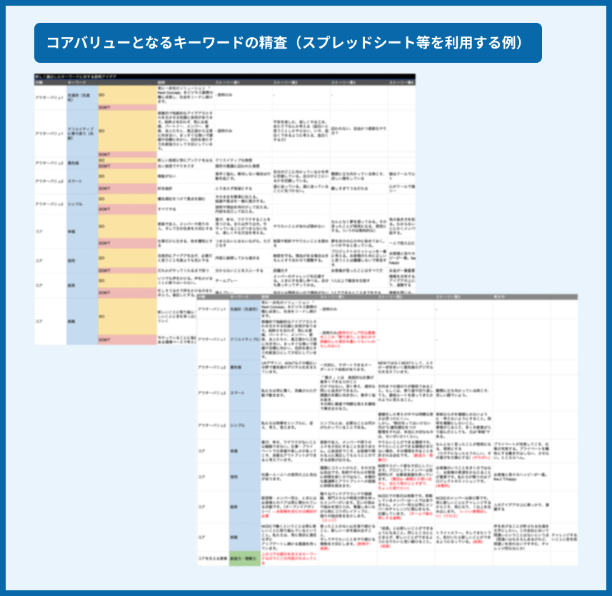 この段階で重要なキーワードを再度振り返り、体現する文章やストーリー(物語)として具体化していきます。ブランドパーソナリティのキーワードを再度見直したり、ストーリーの中に言葉の持つ意味合いがしっかりと反映されているかを再確認し、振り返ることで、より適切な表現を模索します。