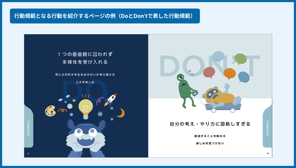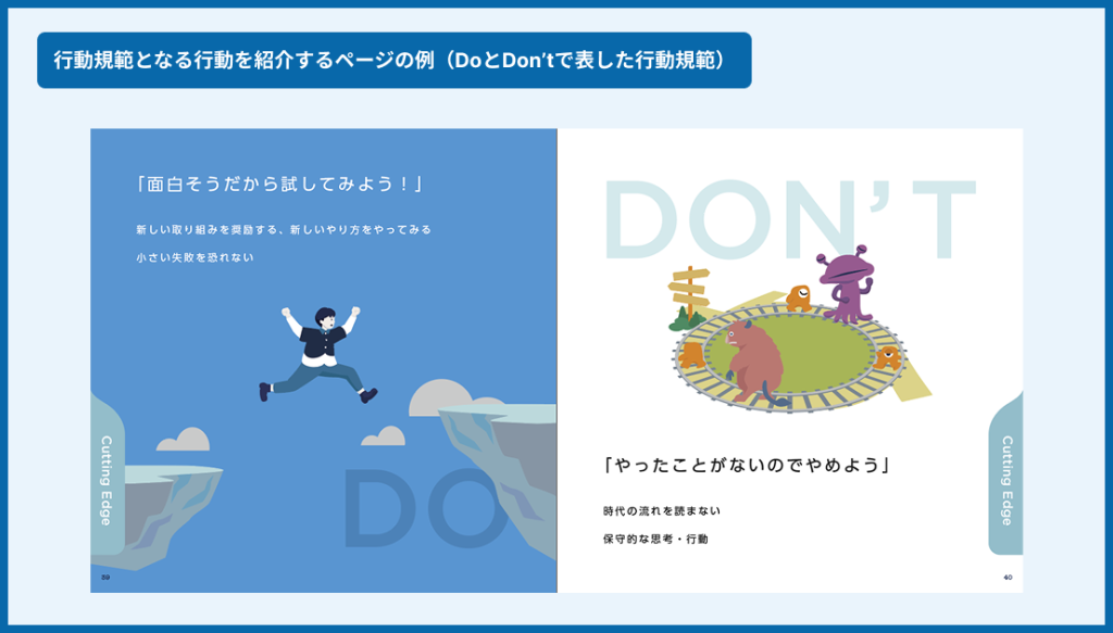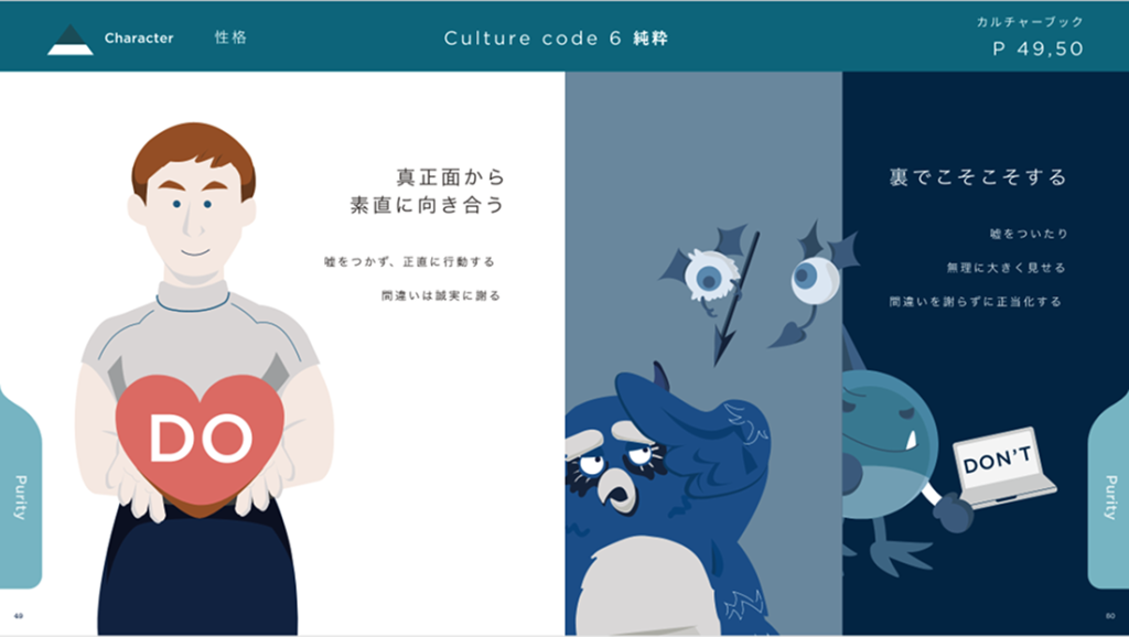 弊社のカルチャーブックでは、行動規範に則った行動を紹介するページを設けることにしました。