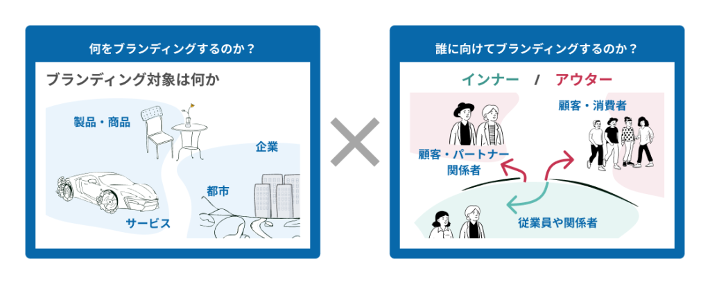 「何をブランディングするのか(対象)」と「誰にブランディングするのか(範囲)」を理解することによって、目的と重きをおく観点が異なってきます。