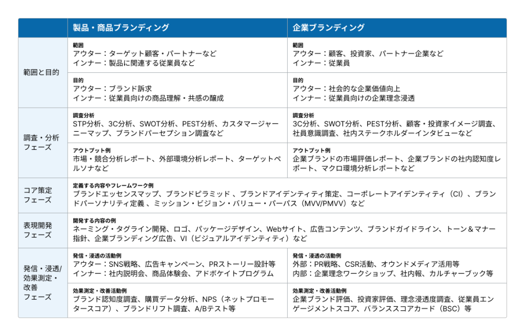 以下にここまでの内容を、「製品・商品ブランディング」と「企業ブランディング」についてまとめました。