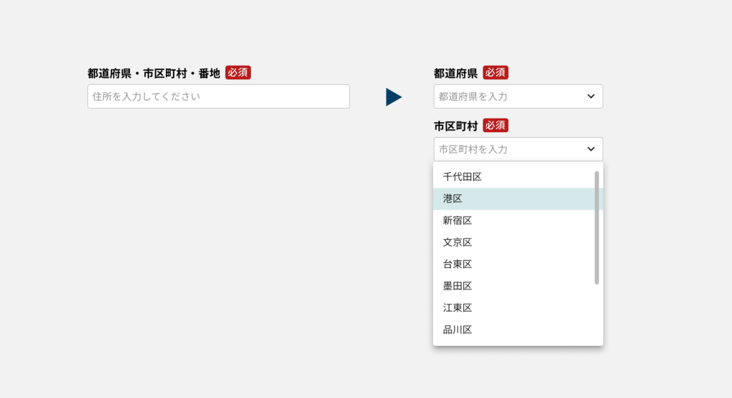 - 選択肢の提供:都道府県や市区町村などの定型的な情報は、プルダウンメニューや選択リストで提供することで、入力を大幅に減らせます。これにより、ユーザーは正確な情報を素早く選択でき、入力ミスも防げます。