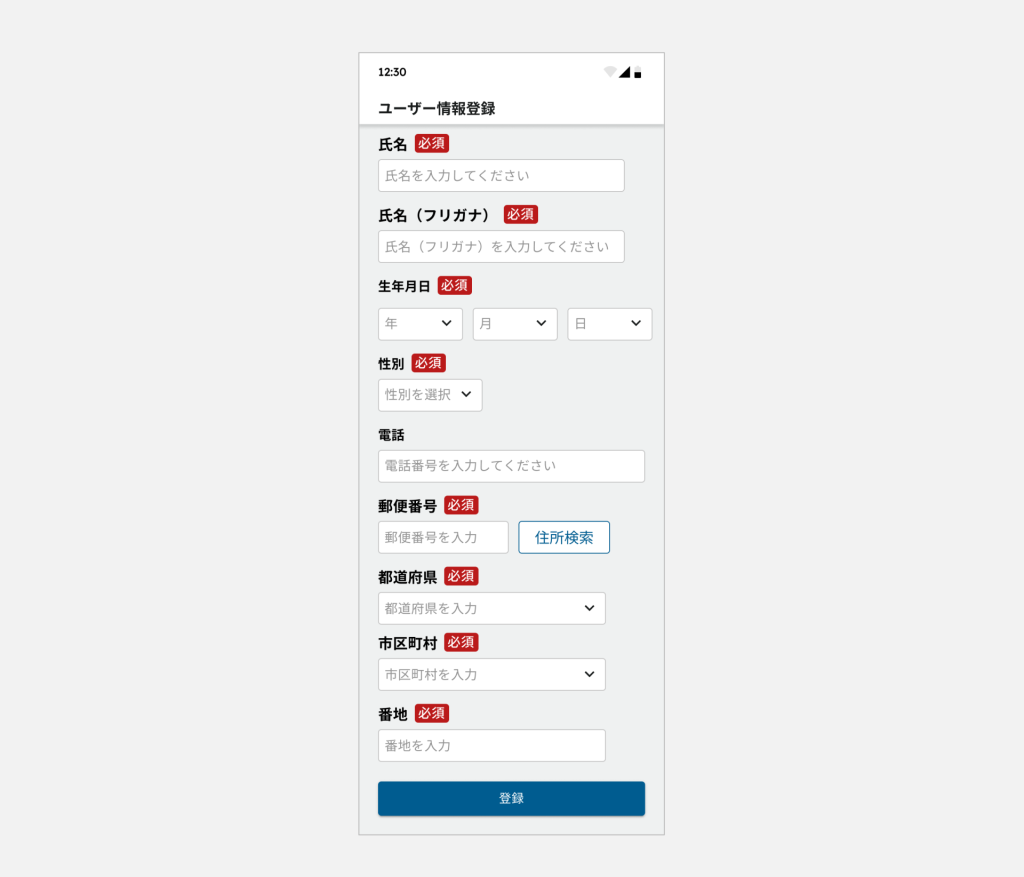 - 必須項目は、アスタリスク(*)ではなく「必須」というラベルで明確に示し、ユーザーが誤って未入力のまま進んでしまうことを防ぎます。