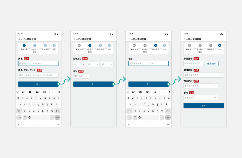 - 複数の入力項目がある場合は、情報をいくつかのステップに分割し、一度に表示する項目を減らすことで、ユーザーの認知負荷を軽減できます 。各ステップで進行状況を明確に示し、ユーザーが安心して入力できるようにします。