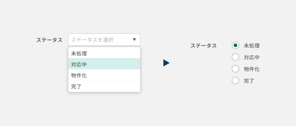 - 選択肢が少ない場合は、ラジオボタンを使用することで、すべての選択肢を常に表示し、クリック1回で選択を完了できます 。これにより、操作の効率が向上し、ユーザーの意思決定も迅速になります。