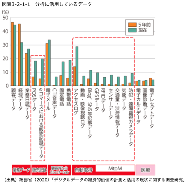 近年、現場データの活用が急速に進んでいます。特にPOSやEコマースによる販売記録、そして M2Mデータを含む自動取得データの活用が大きく進展していることが、2020年の総務省のデータからも伺えます。このような状況は、各企業におけるIoTの導入加速によってもたらされています。