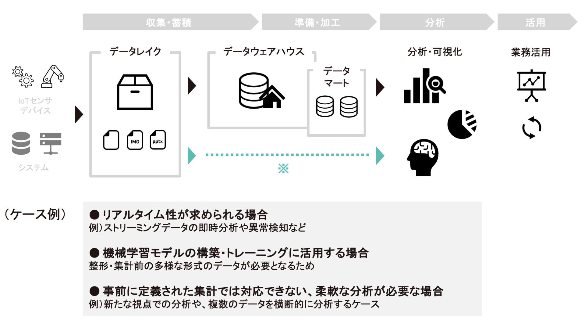 ストリーミングデータ、バッチ処理、構造化データ、非構造化データなど、用途ごとに最適な処理・分析方法が異なります。データレイクから直接分析するケースや、データウェアハウスに整理して使うケースなど、状況に応じて構成を選ぶことが大切です。