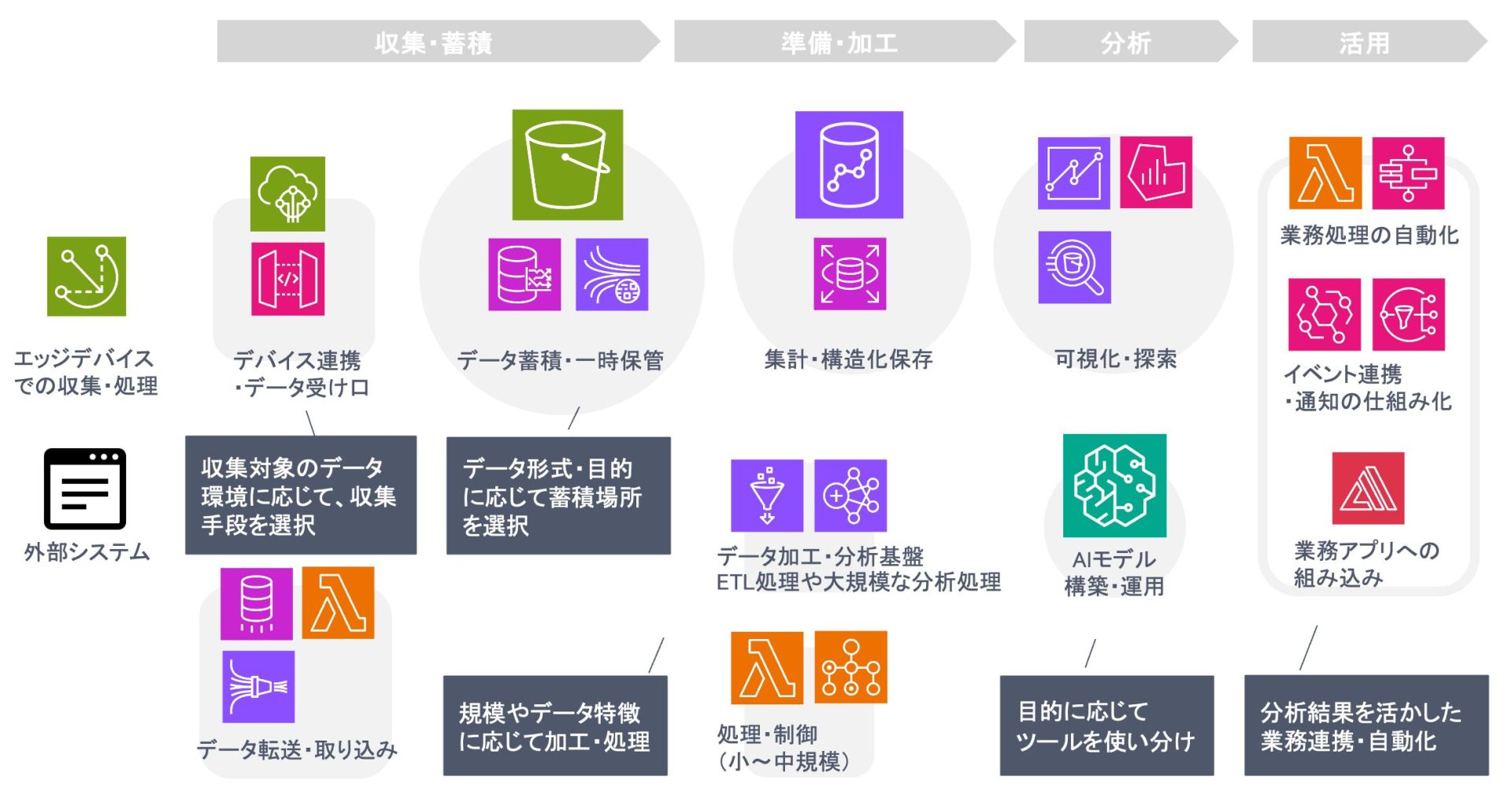 データの可視化(BIツールによるダッシュボード作成)から、AIモデルの構築(予測・異常検知のための機械学習)、アドホックな集計・分析まで、目的に応じて多様なツールやサービスを使い分けます。扱うデータの規模、求められるリアルタイム性、分析手法の複雑さなど、要件に応じて最適なサービスを選択することが求められます。