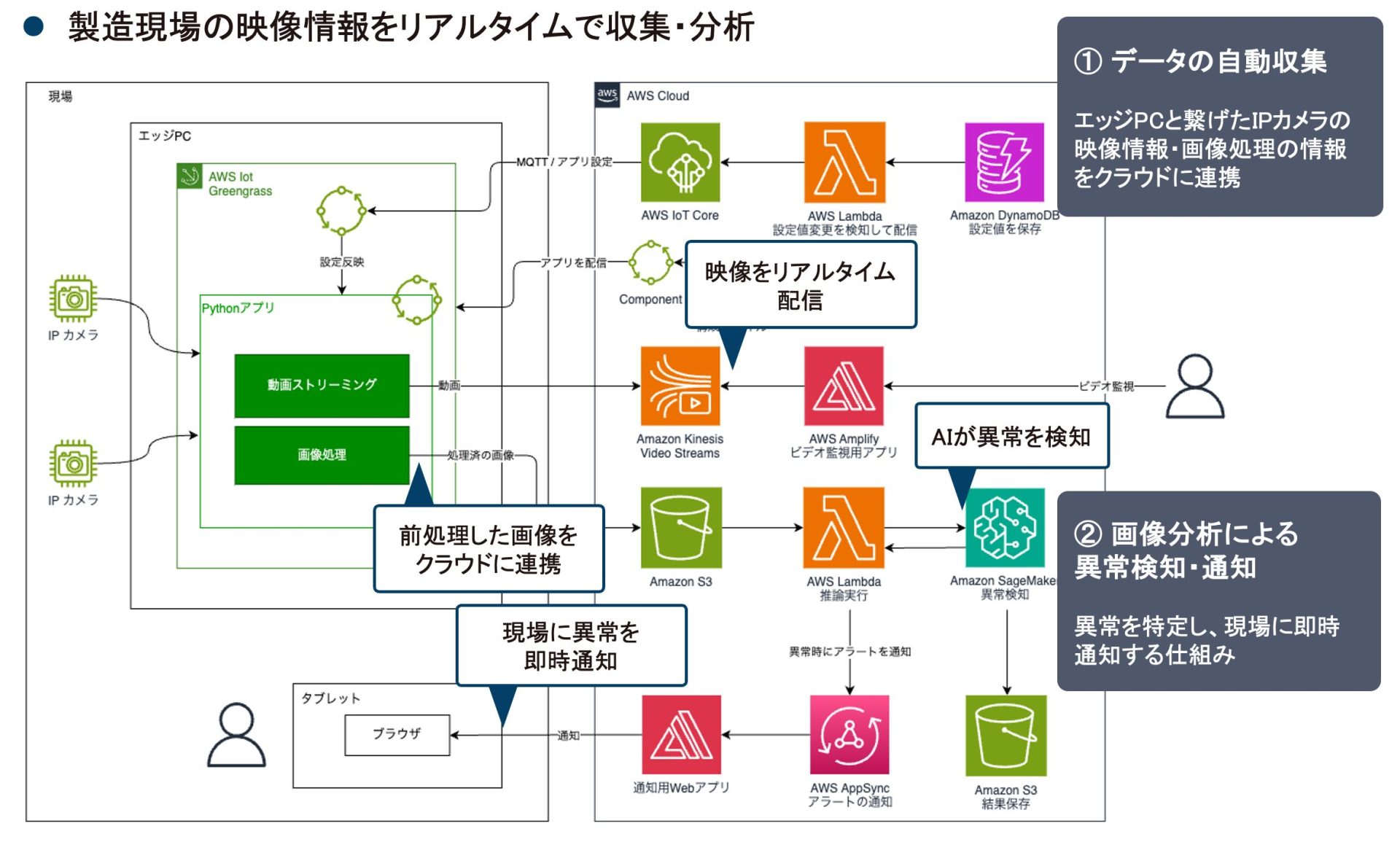 IPカメラの映像を Amazon Kinesis Video Streams で受信し、AI が画像をリアルタイムで分析します。異常を検知した場合、現場へ即座にアラートを自動通知する仕組みです。人間の目視を超える速度と精度で、迅速な対応と品質管理の向上を可能にします。このように複数のケースを組み合わせることで、より業務で活用できるシステムを構築することが可能です。